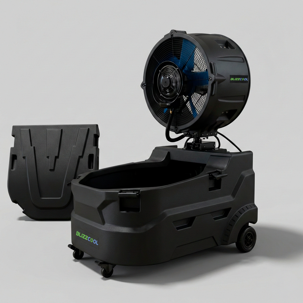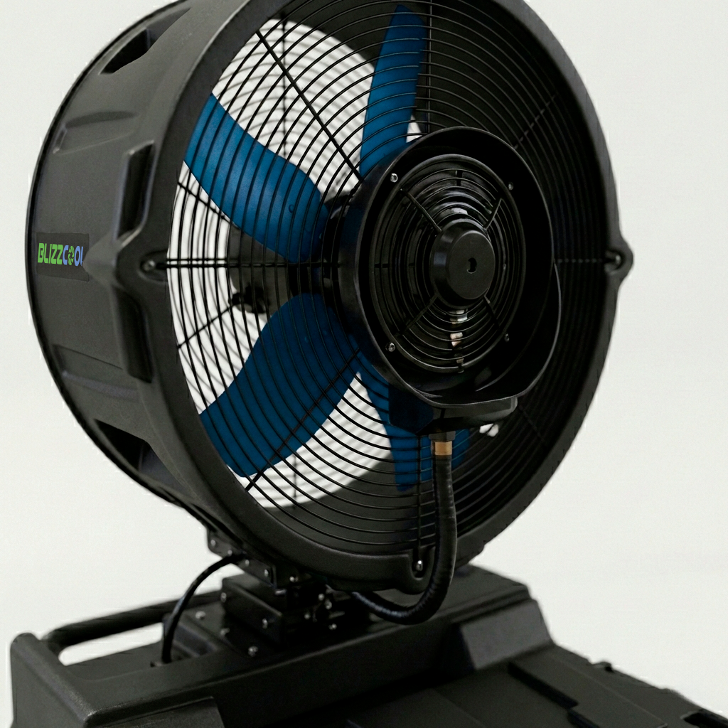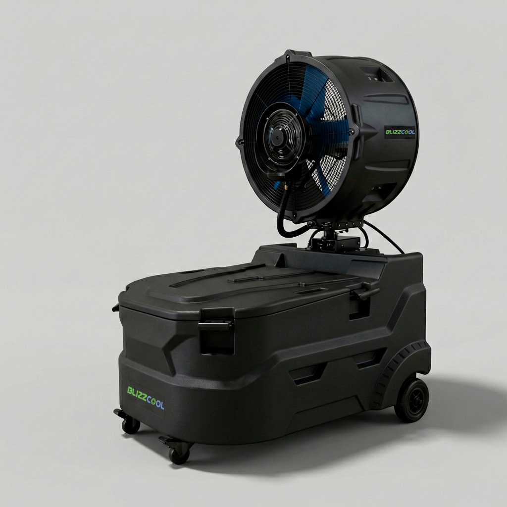 Enfriador nebulizador portátil de gran capacidad (380 L), diseñado para climatizar zonas deportivas, torneos y grandes eventos en exteriores. Ofrece alto caudal de aire, 3 velocidades, control regulable de niebla y cobertura de hasta 250 m² para jornadas intensivas.